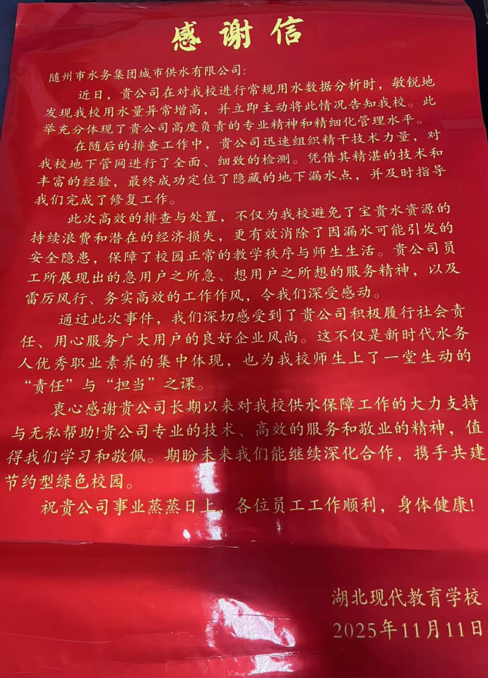一面鐫刻著“明察秋毫堵漏點,傾心服務暖師生”的鮮紅錦旗,隨同滿載深情的感謝信,被湖北現(xiàn)代教育學校負責人鄭重送到隨州市水務集團城市供水公司。紙短情長,字里行間飽含對公司快速解決校園供水困境的誠摯謝意。